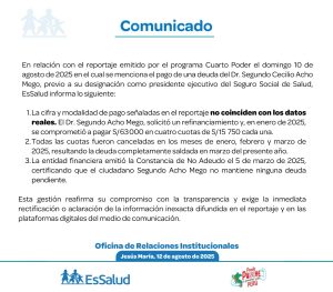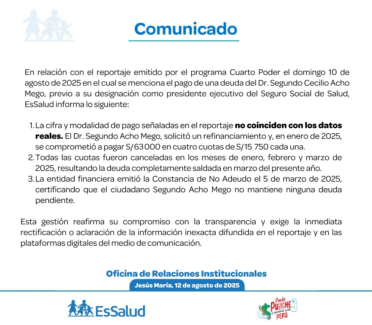 Segundo Acho Mego, presidente de EsSalud, ha emitido un comunicado y presentado documentos para desmentir el reportaje de un programa periodístico dominical, el reportaje afirmaba que Acho Mego había pagado una deuda sin justificar la procedencia de los fondos. En respuesta, Acho Mego y EsSalud sostienen que la información del reportaje es inexacta. El presidente ha enviado una carta aclaratoria y adjuntado "medios probatorios" para respaldar su versión.