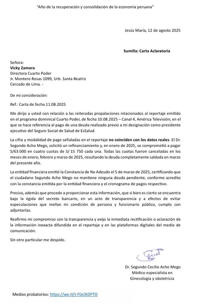 Rechazo de manera categórica cualquier insinuación que afecte mi honor e integridad profesional. En defensa de la transparencia y la verdad, he remitido una carta aclaratoria al programa Cuarto Poder y adjunto los medios probatorios: https://t.co/fxnox4aA77 pic.twitter.com/9gMTlR1bEY— SegundoAchoMego (@Segundo_Acho_M) August 13, 2025