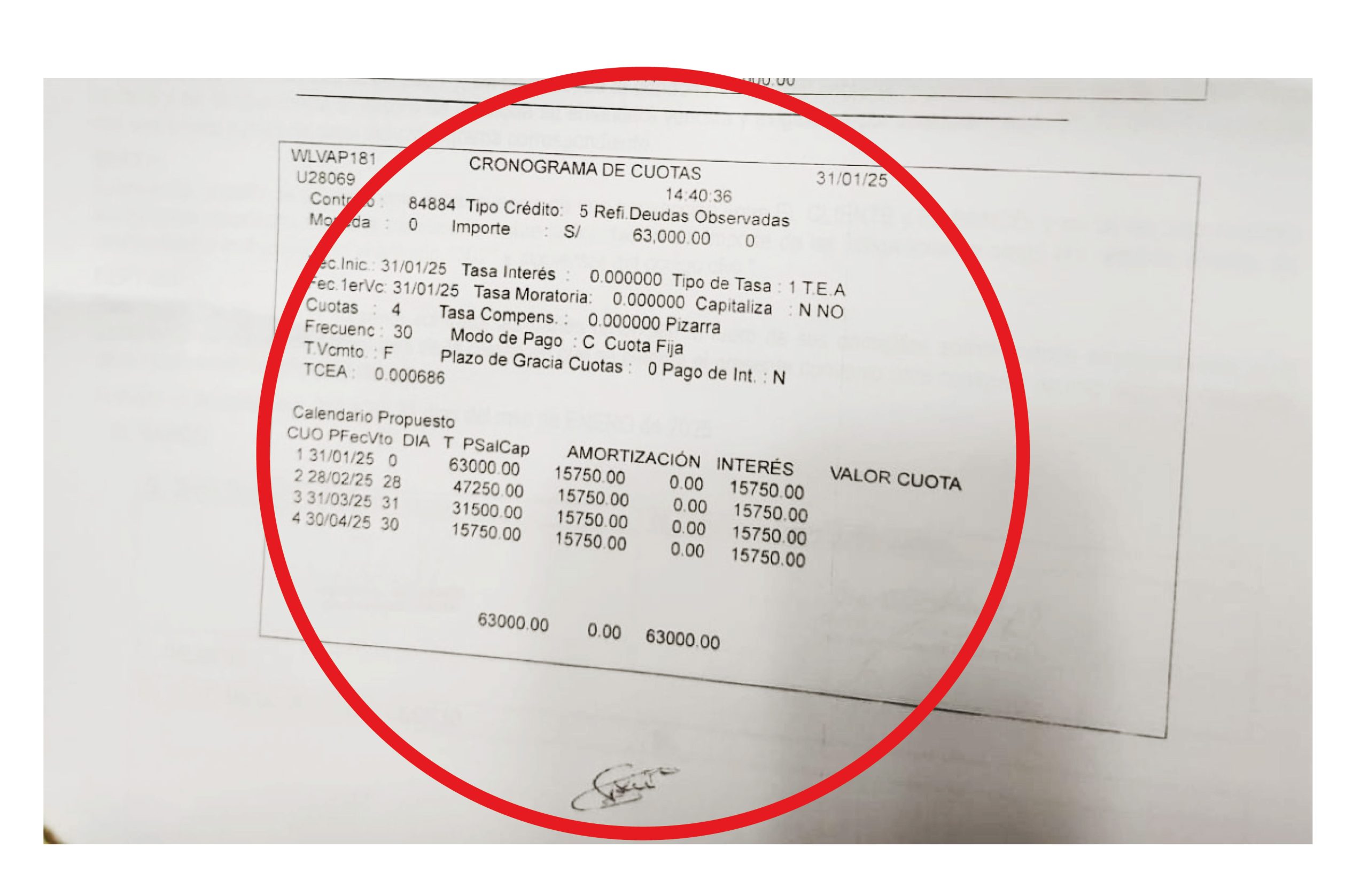 Defensa de Segundo Acho Mego y EsSaludLa defensa de Acho Mego se basa en los detalles de una deuda que fue refinanciada. Tanto él como EsSalud afirman que en enero de 2025, refinanció una deuda de S/ 63,000, la cual se pagaría en cuatro cuotas de S/ 15,750 cada una. Los documentos indican que las cuotas de enero, febrero y marzo de 2025 fueron canceladas, saldando la deuda por completo.