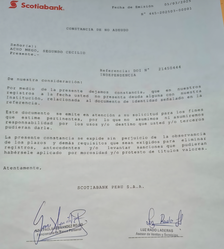 "Constancia de No Adeudo" de Scotiabank. Este certificado, emitido el 5 de marzo de 2025, confirma que no tiene deudas pendientes con la institución. El documento identifica a Segundo Cecilio Acho Mego con el DNI N° 21450444.