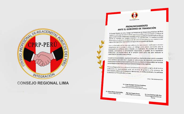 El Consejo Regional de Lima del Colegio Profesional de Relacionistas Públicos del Perú emitió un pronunciamiento en el que expresa su preocupación ante la actual coyuntura política que atraviesa el país y exhorta al presidente de la República, señor José Enrique Jerí Oré, a ejercer su mandato con respeto absoluto a la Constitución, la institucionalidad democrática y los derechos fundamentales de todos los peruanos.