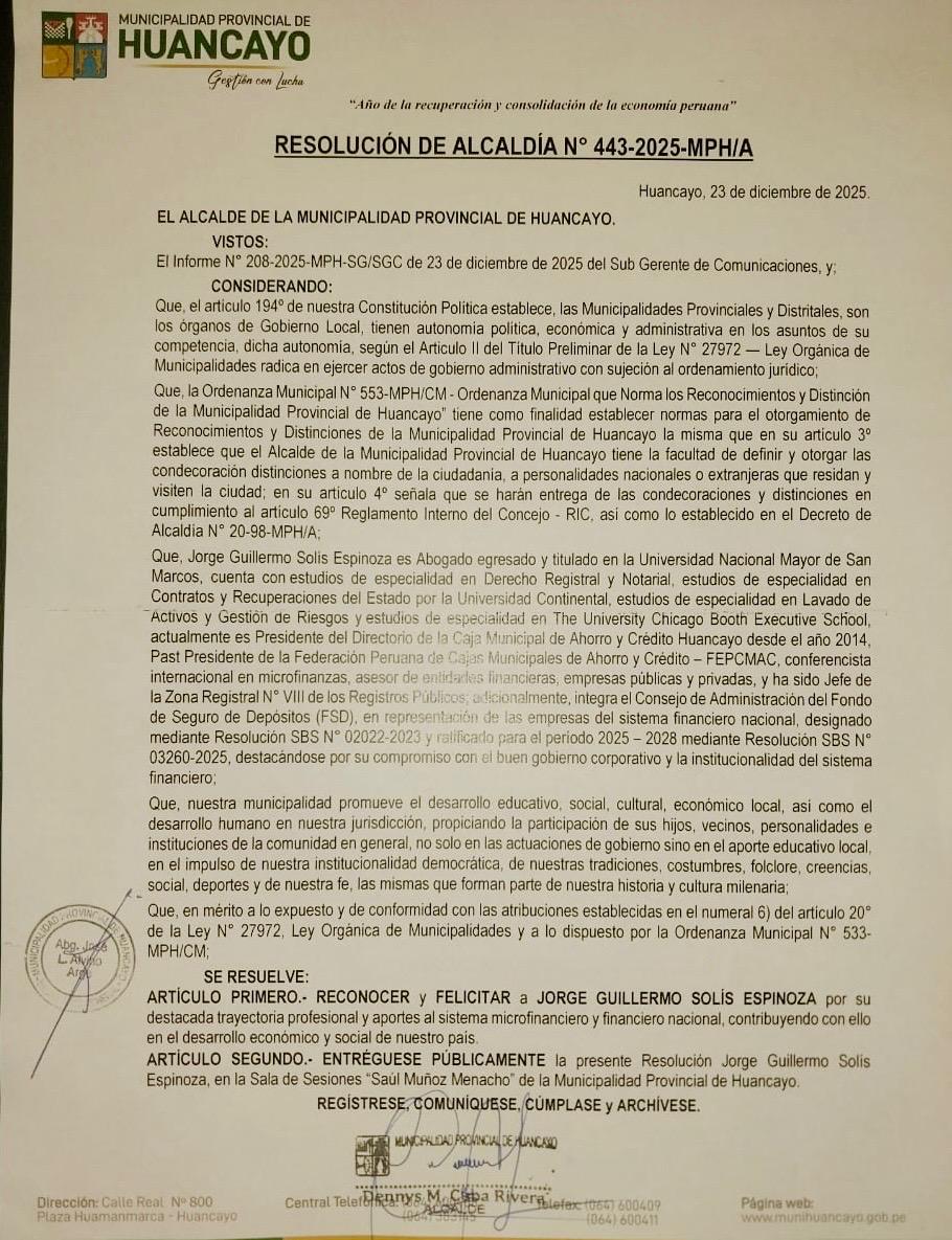 En reconocimiento a su destacada trayectoria profesional y a su valioso aporte al fortalecimiento del sistema microfinanciero nacional, el señor Jorge Solis Espinoza recibió la Resolución de Alcaldía 443-2025, distinción que resalta su contribución al desarrollo económico del país.La ceremonia de entrega realizada en la sala de sesiones de entidad municipal estuvo a cargo del Alcalde Dennys Cuba Cotera, quien destacó el liderazgo y la visión estratégica de Solis Espinoza, así como su permanente compromiso con la inclusión financiera, la innovación y el impulso de iniciativas orientadas a dinamizar la economía y ampliar el acceso a servicios financieros para miles de peruanos.Durante el acto, la autoridad edil subrayó que el reconocimiento responde a una carrera caracterizada por la ética profesional, la gestión responsable y el impacto positivo en el crecimiento del sector financiero, elementos que han contribuido de manera significativa al progreso económico y social a nivel nacional.Jorge Solis Espinoza agradeció la distinción y reafirmó su compromiso de continuar trabajando en favor del desarrollo sostenible, la educación financiera y el fortalecimiento institucional, pilares fundamentales para consolidar una economía más inclusiva y competitiva.Con este reconocimiento, la municipalidad pone en valor el aporte de profesionales que, desde su ámbito de acción, contribuyen de manera decisiva al desarrollo del país.